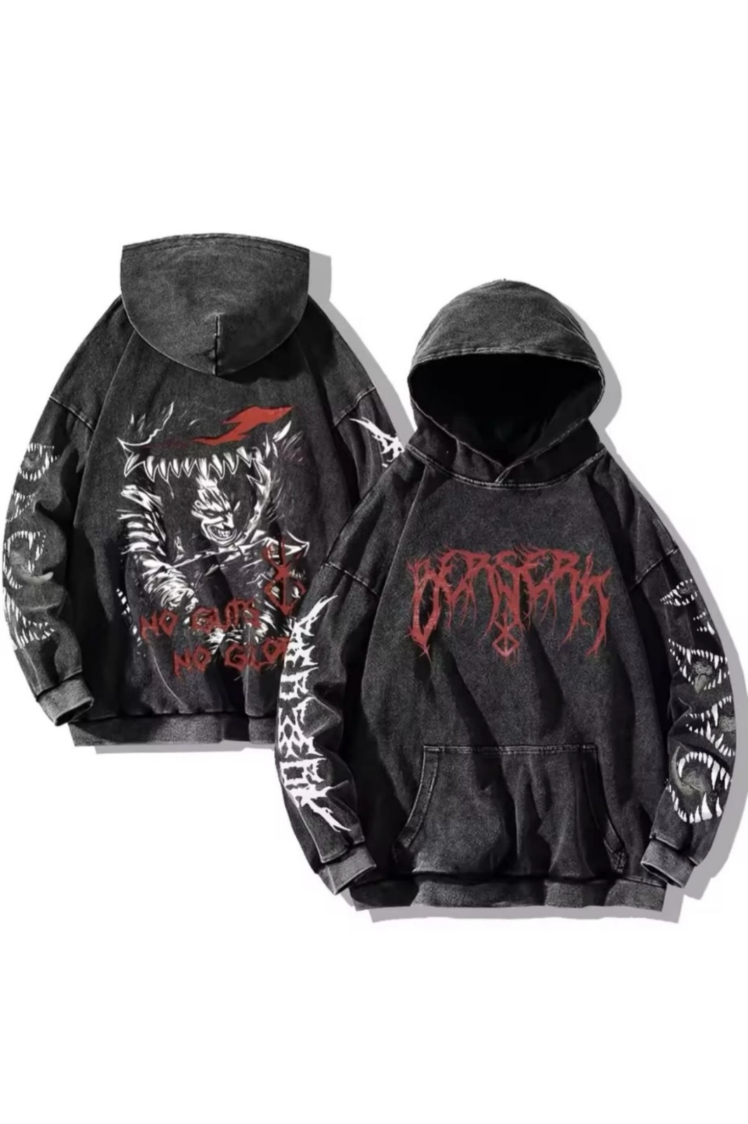 Anime Berserk No Guts No Glory Yıkamalı Kumaş Kapüşonlu Sweatshirt