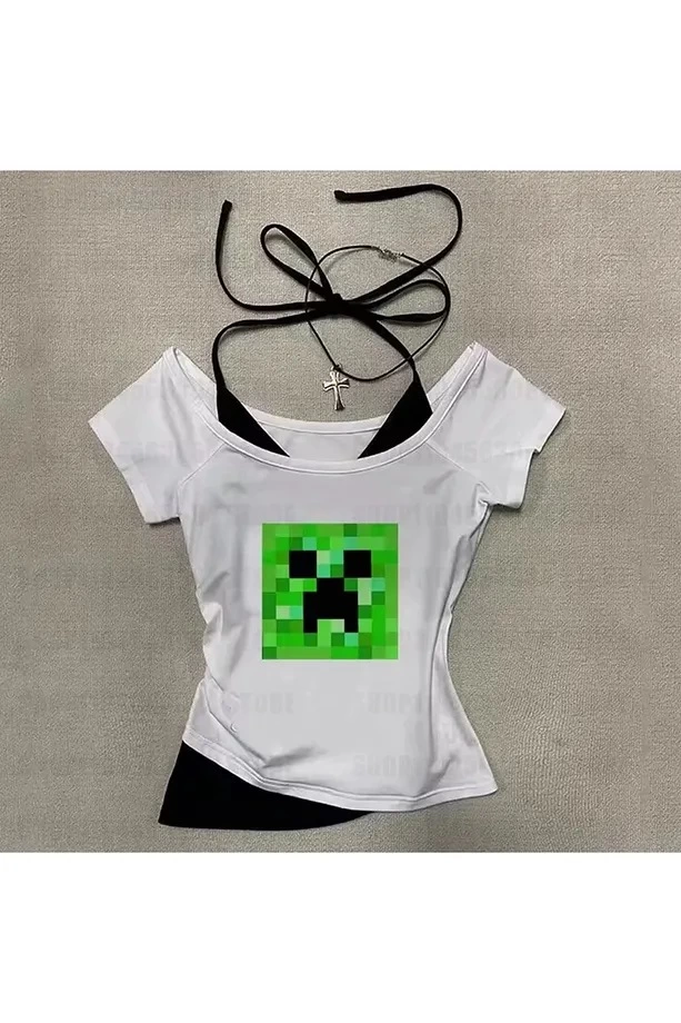 Beyaz Gothic Creeper Yaka Ek Askılı Kısa Kollu Full Body Crop