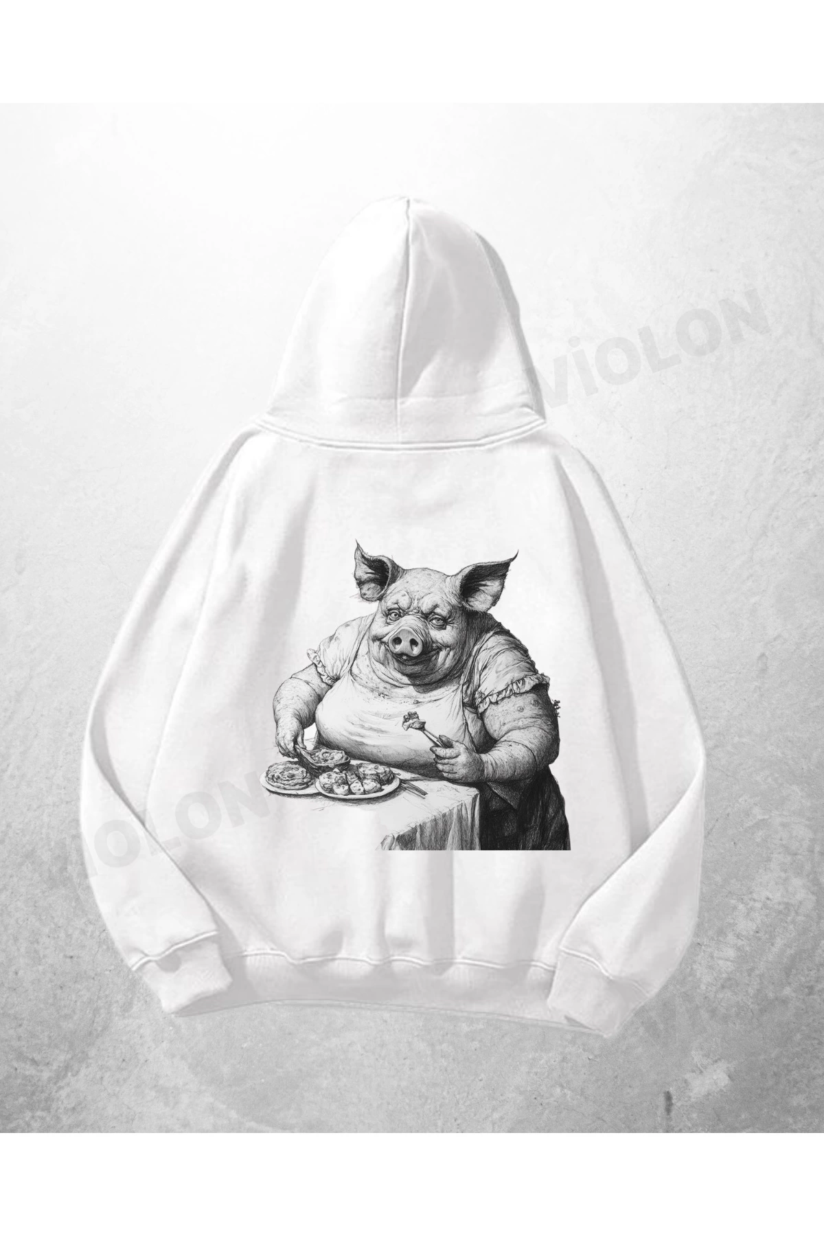 Beyaz Unisex Domuz Şef Baskılı Oversize Hoodie Sweatshirt