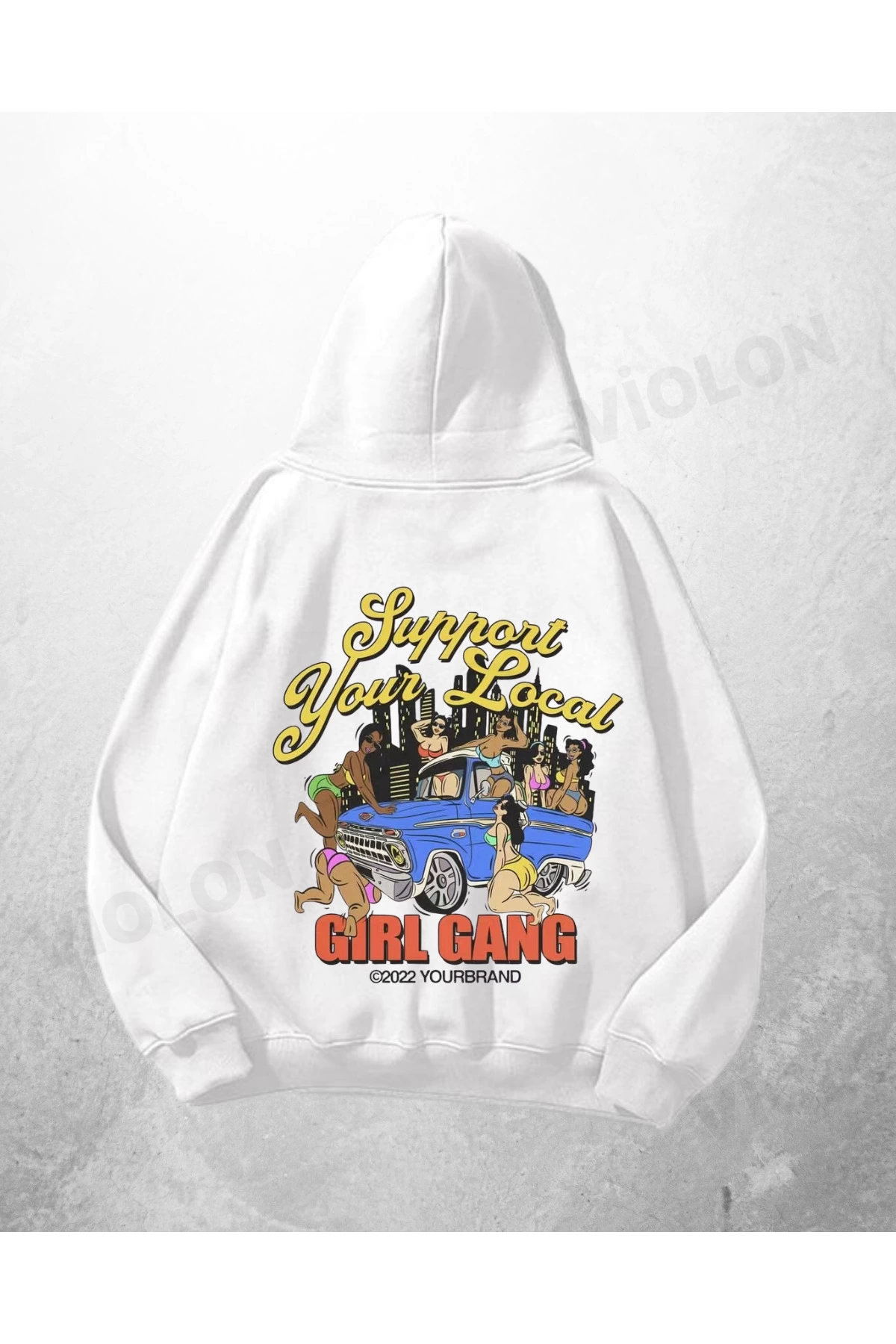 Beyaz Unisex Girl Gang Baskılı Oversize Hoodie Sweatshirt