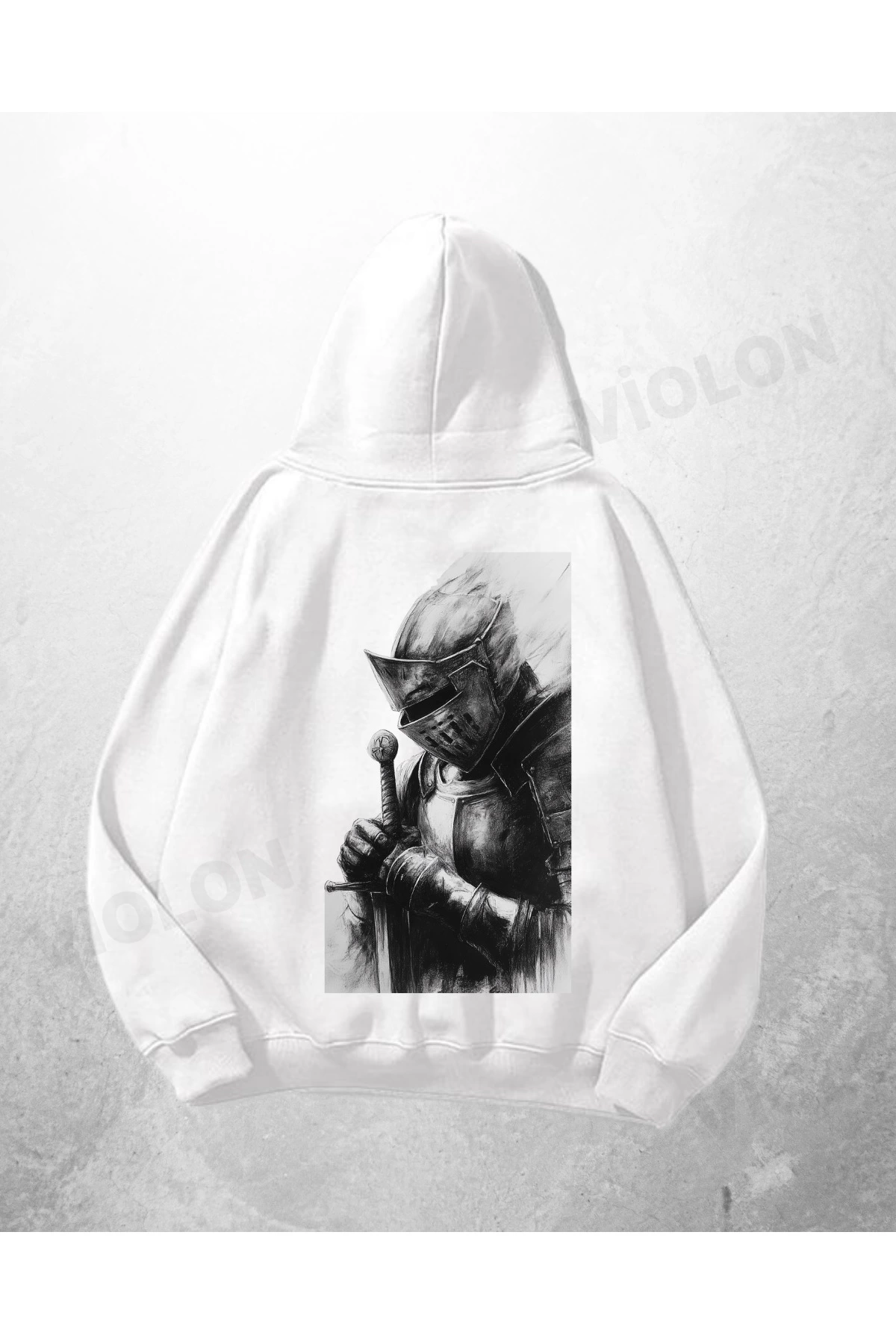 Beyaz Unisex Knight Prayer Baskılı Oversize Hoodie Sweatshirt