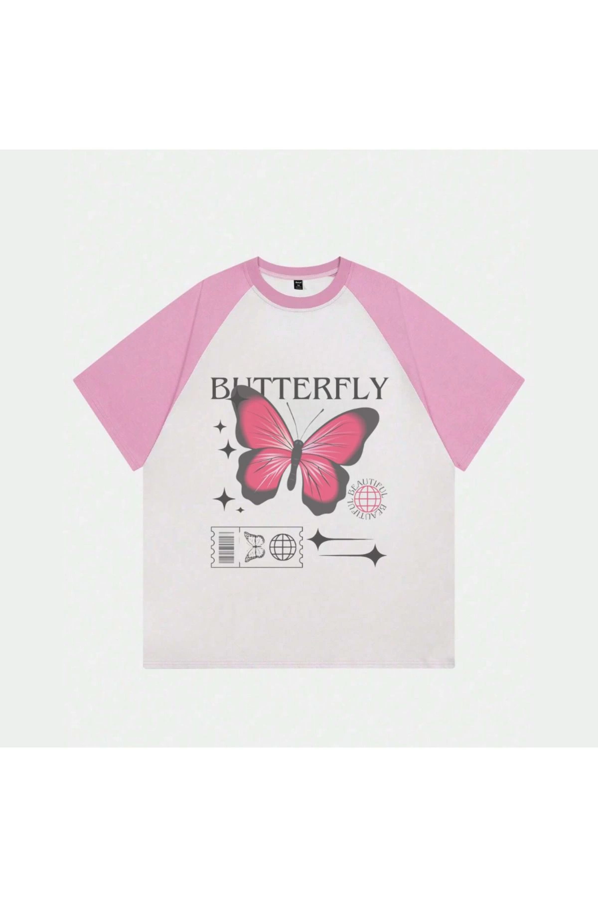 Beyaz Unisex Pembe Reglan Butterfly T-Shirt