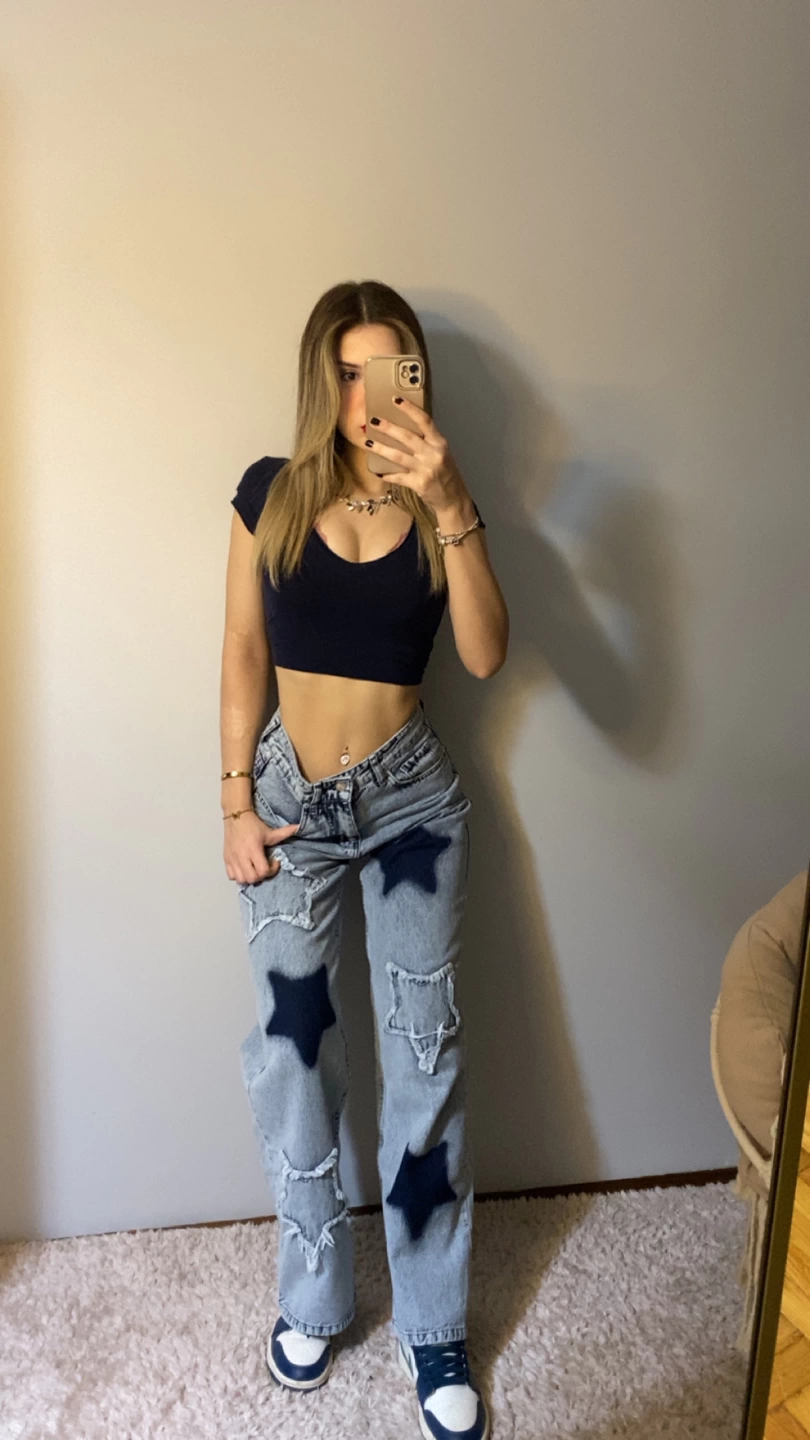 Buz Mavisi Bol Paça Lacivert Yıldız ve Patch Yıldızlı Kot Pantolon