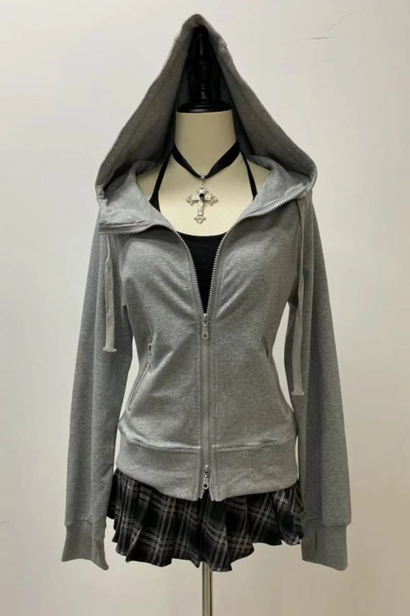 Gri Melanj Düz Cepli Street Y2K Crop Hırka