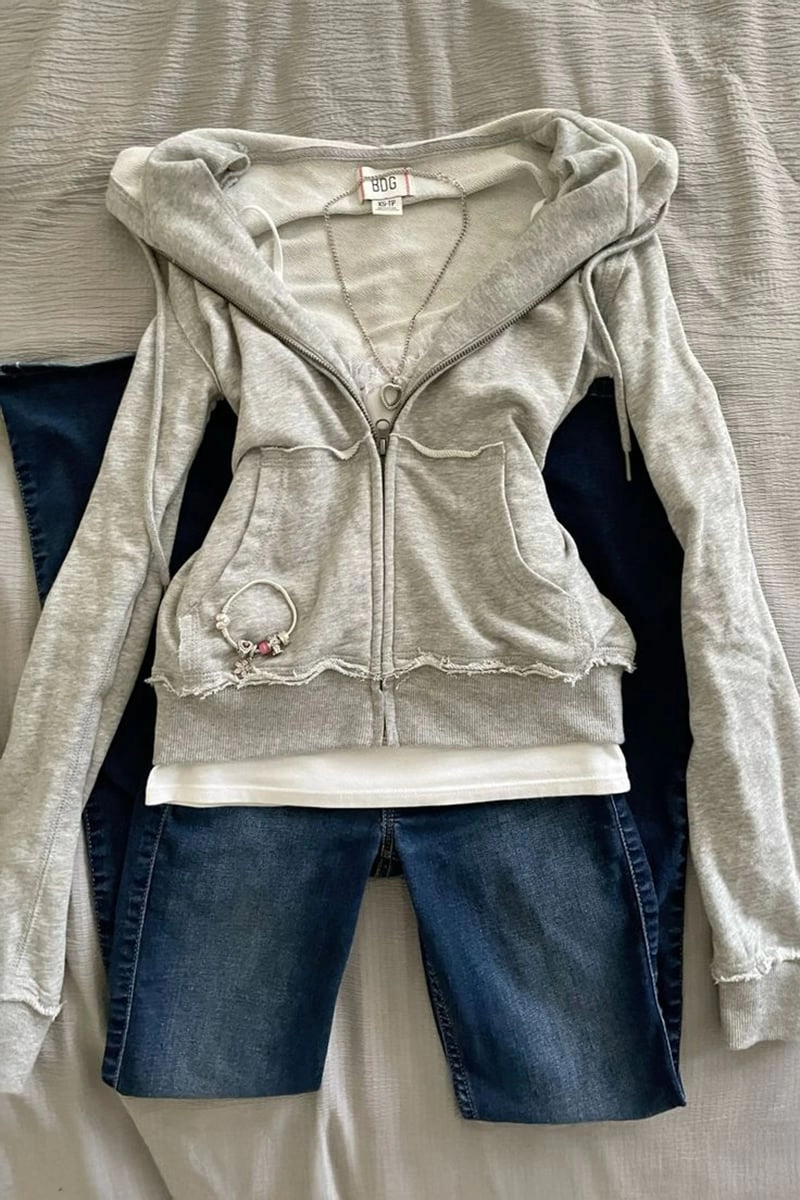 Gri Melanj Yırtık Detaylı Street Y2K Crop Hırka