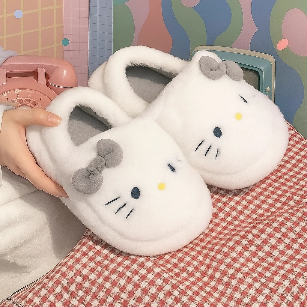 Hello Kitty Gri Yumuşak Tüylü Peluş Panduf Terlik