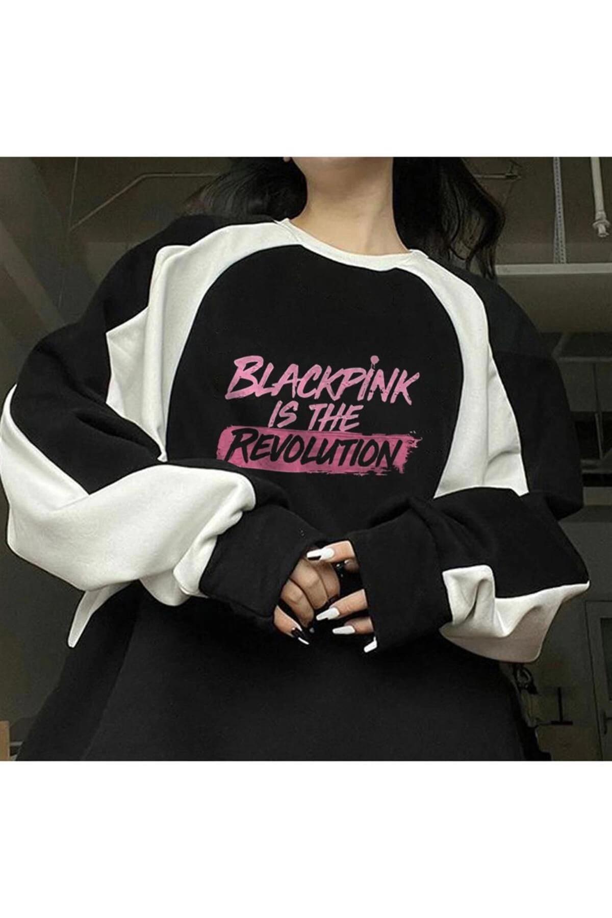 LAGOM MODA Blackpink Is The Revolution Baskılı Line Detail Unisex Oversize Bisiklet Yaka Siyah