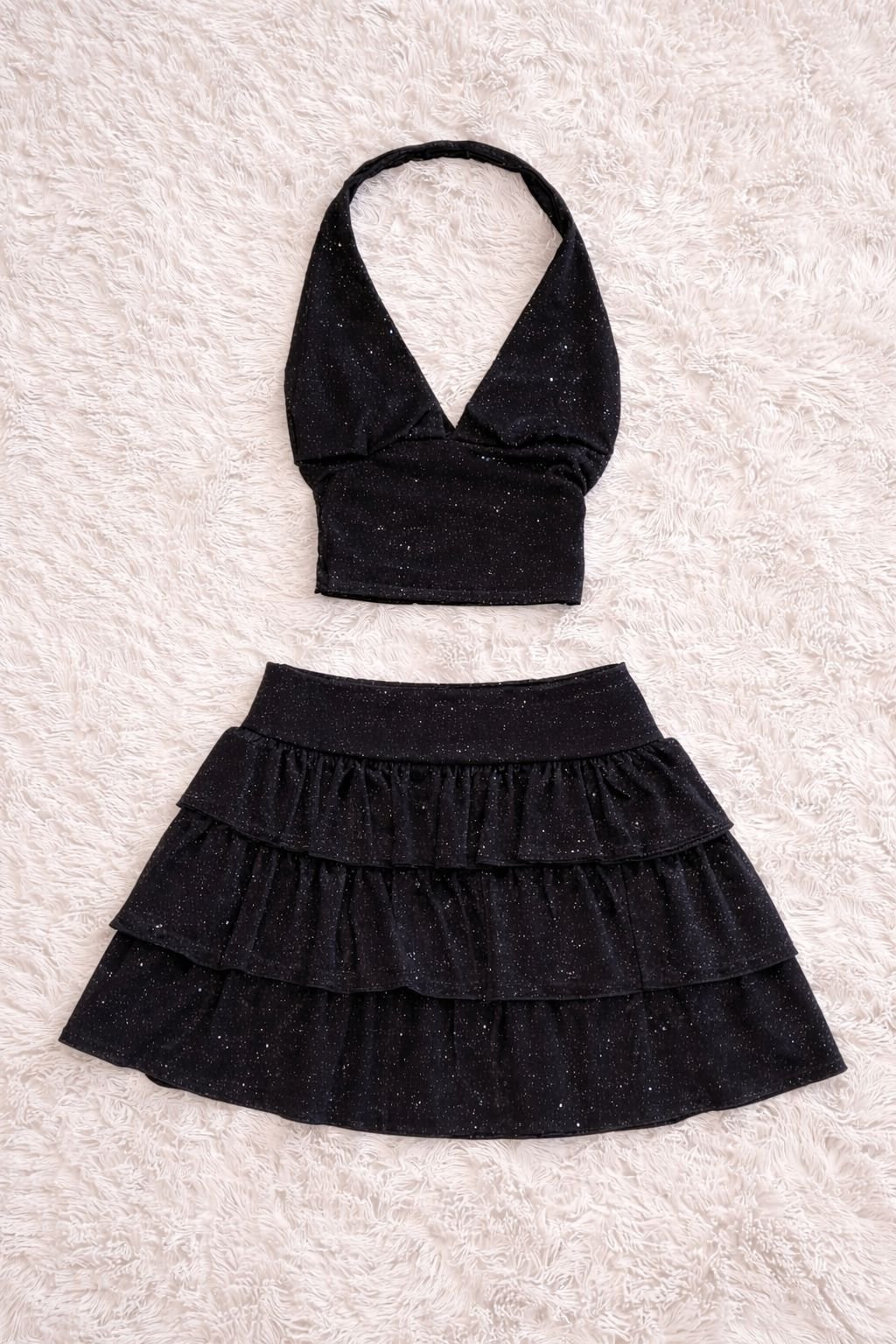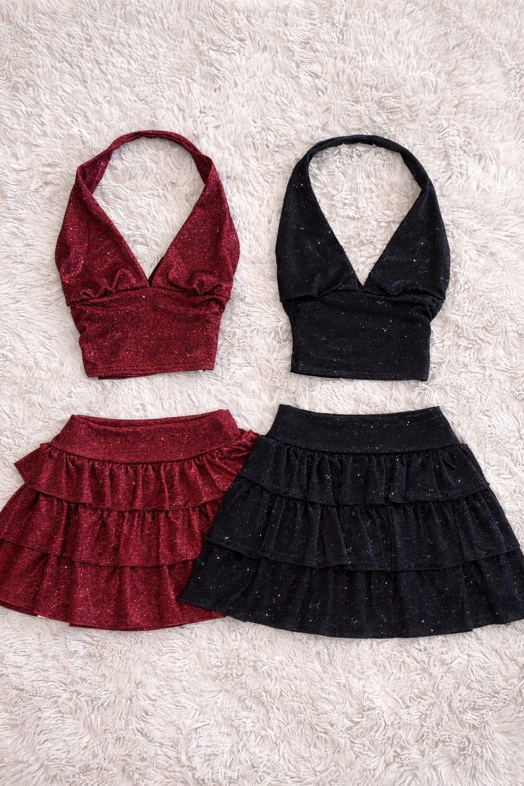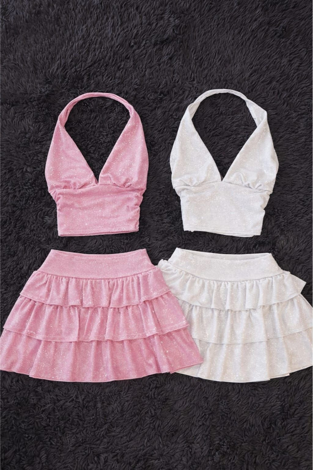 Luxy Cristal koleksiyonundan şık ve göz kamaştırıcı bir takım. Kristal sim detaylarıyla bezeli bluz, kısa etek ve şort kombinasyonu ile günlük ve özel günler için ideal bir seçim. Kaliteli kumaş ve dikkat çeken tasarımı ile tarzınızı yansıtın. Rahat kesimi sayesinde bütün gün giyilebilir. Modern kadının vazgeçilmez parçası olan bu takım, gardırobunuza şıklık katacak.