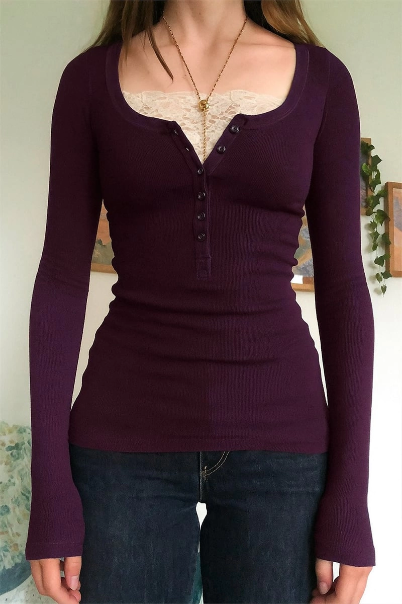 Mürdüm Düğme Detaylı Dantel Yaka Uzun Kollu Bluz