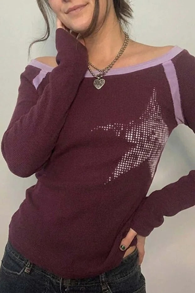 Mürdüm tonunda tasarlanan bu Y2K tarzı crop top, omuz dekolteli kesimi ve parçalı detaylarıyla dikkat çekiyor. Uzun kollu yapısı, sezonun en trend silüetlerinden biri olan off-shoulder tasarımıyla birleşerek sofistike bir görünüm yaratıyor. Yıldız motifli deseni, retro-futuristik Y2K estetiğine mükemmel bir dokunuş katıyor.