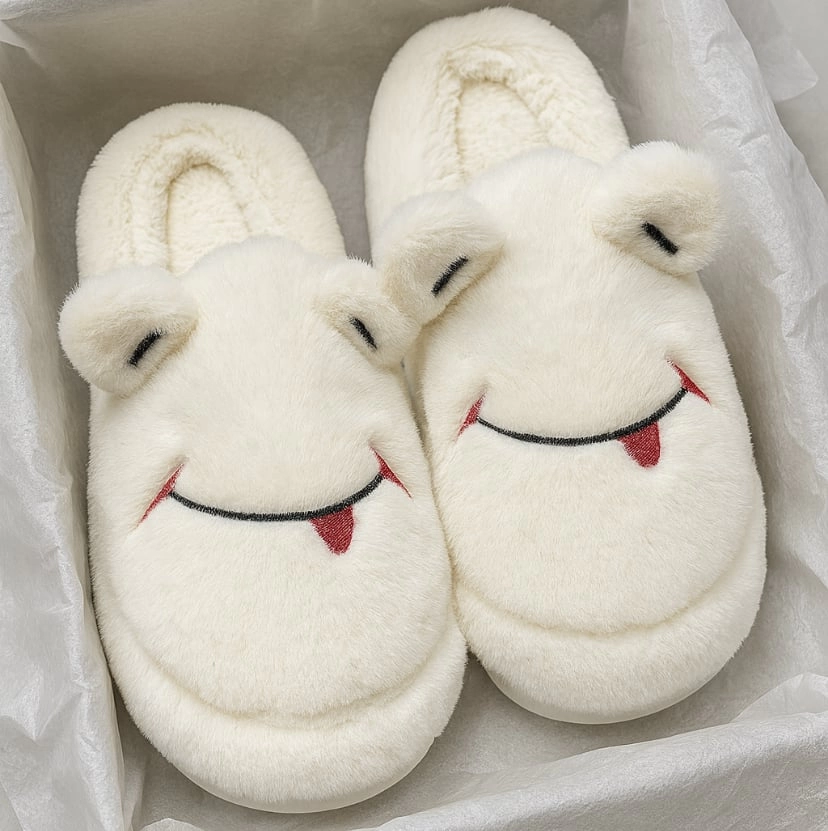 Sevimli Yüz Yumuşak Tüylü Krem Peluş Panduf Terlik