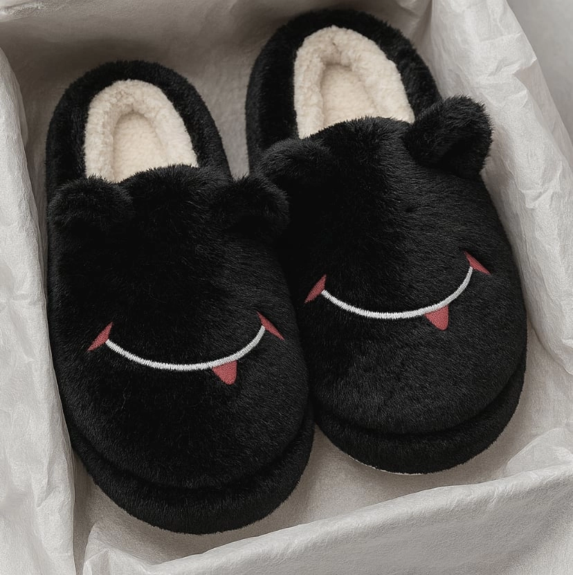 Sevimli Yüz Yumuşak Tüylü Siyah Peluş Panduf Terlik