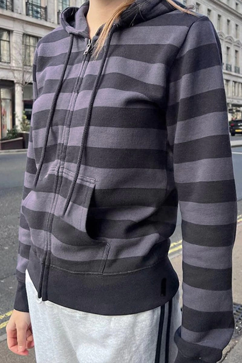 Siyah Füme Çizgili Kapüşonlu Y2K Crop Hırka