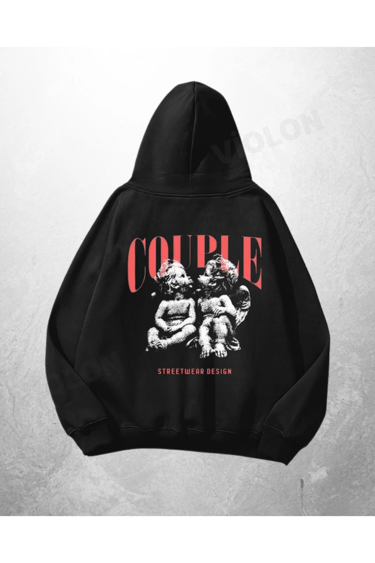 Siyah Unisex Couple Baskılı Oversize Hoodie Sweatshirt