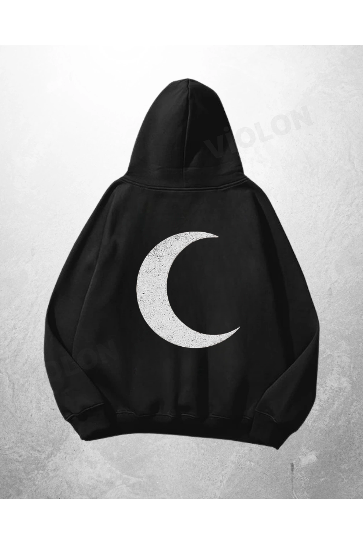 Siyah Unisex Moon Symbol Baskılı Oversize Hoodie Sweatshirt