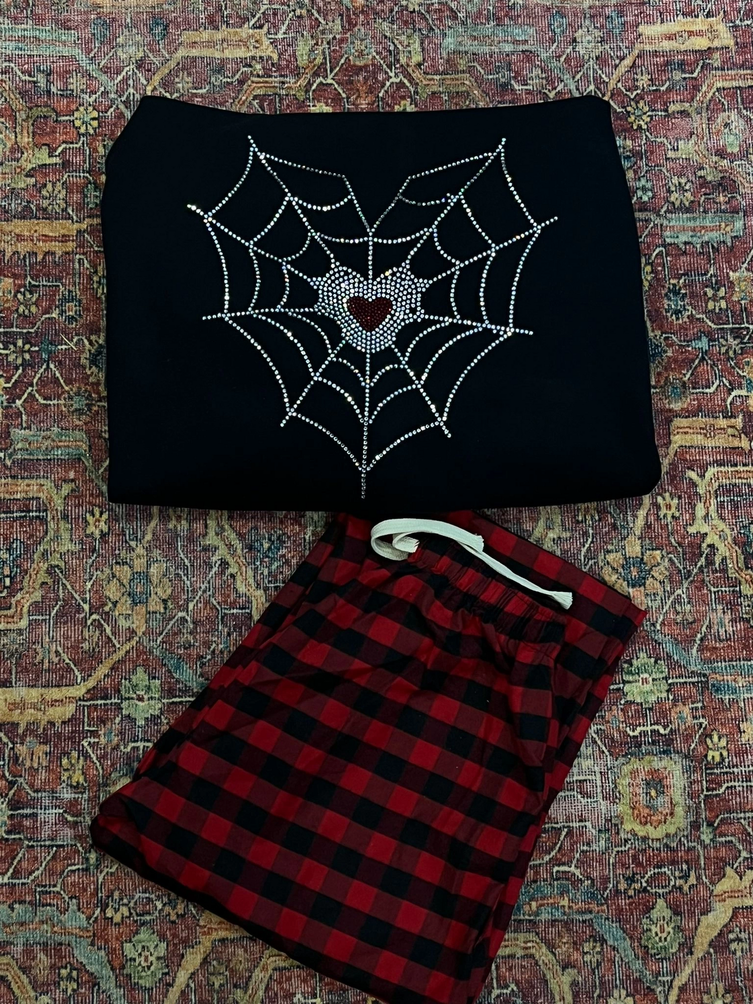 Spider Kalp Parıltılı Taşlı Sırt Baskılı Siyah Sweatshirt + Kırmızı Siyah Ekose Takım