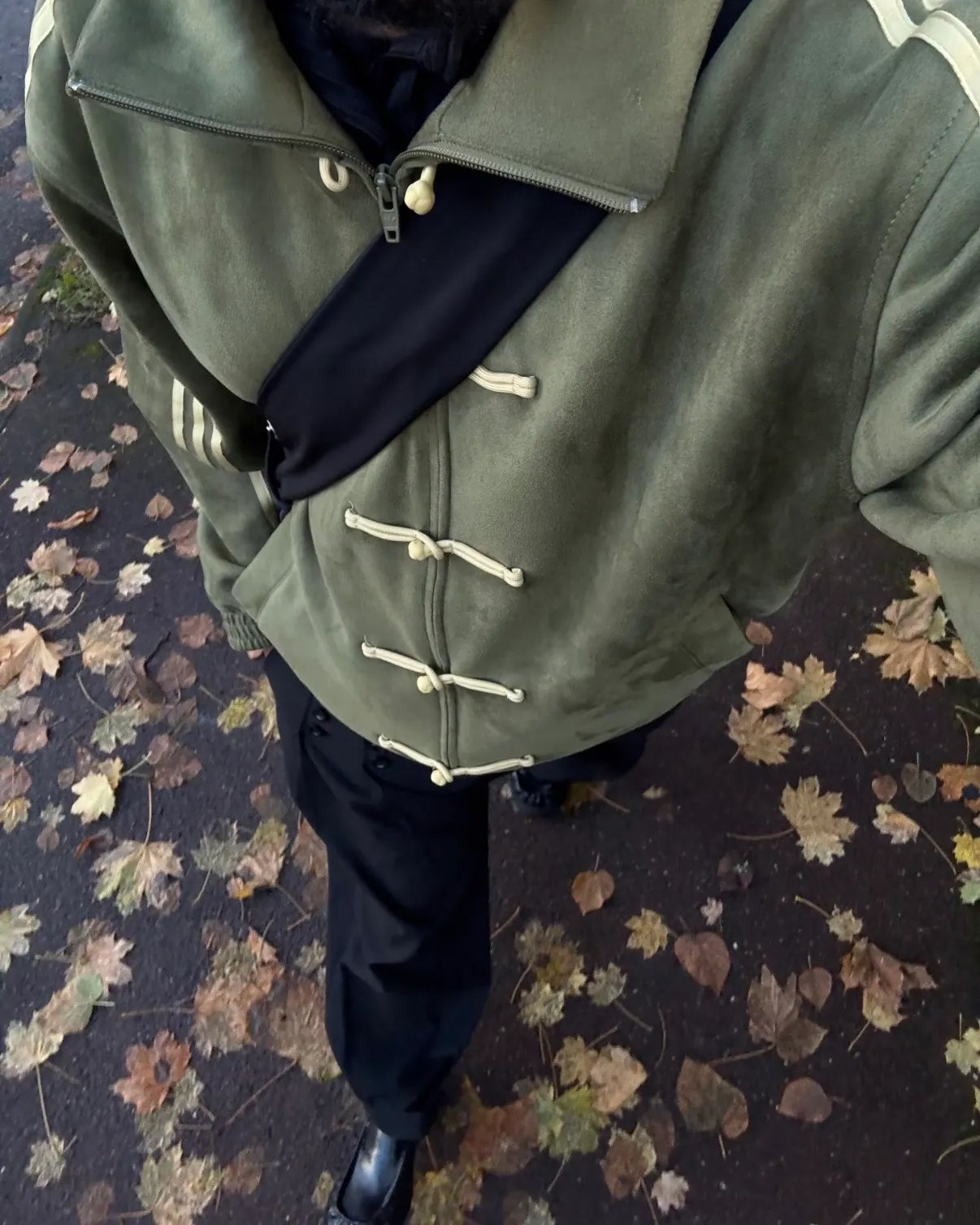 Detaylar: Çapraz düğme detayları ve fermuarlı tasarım.